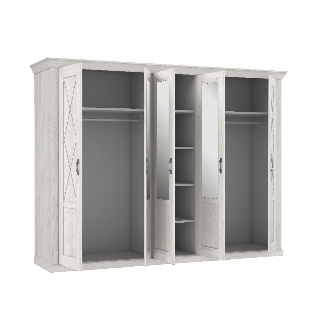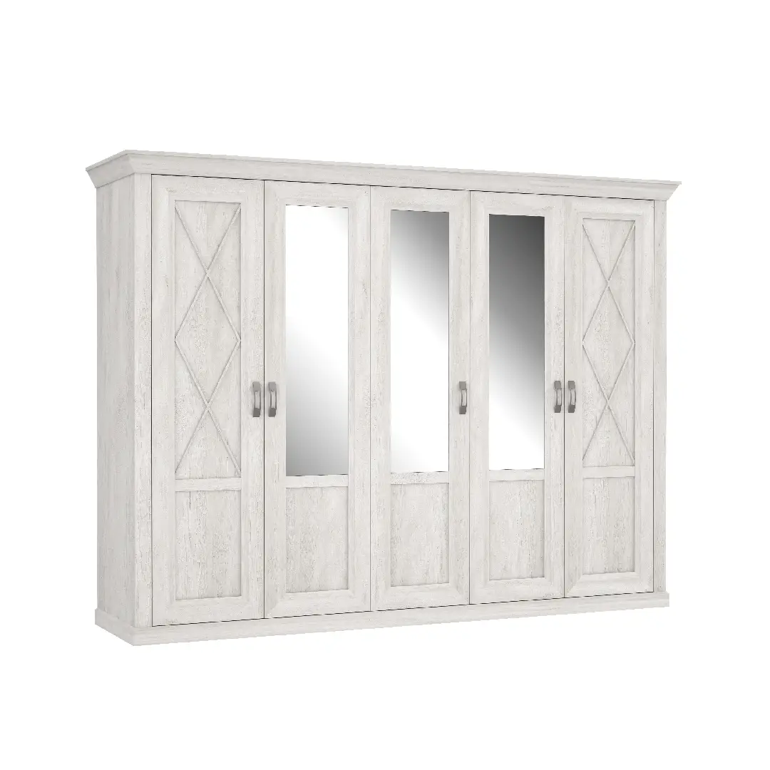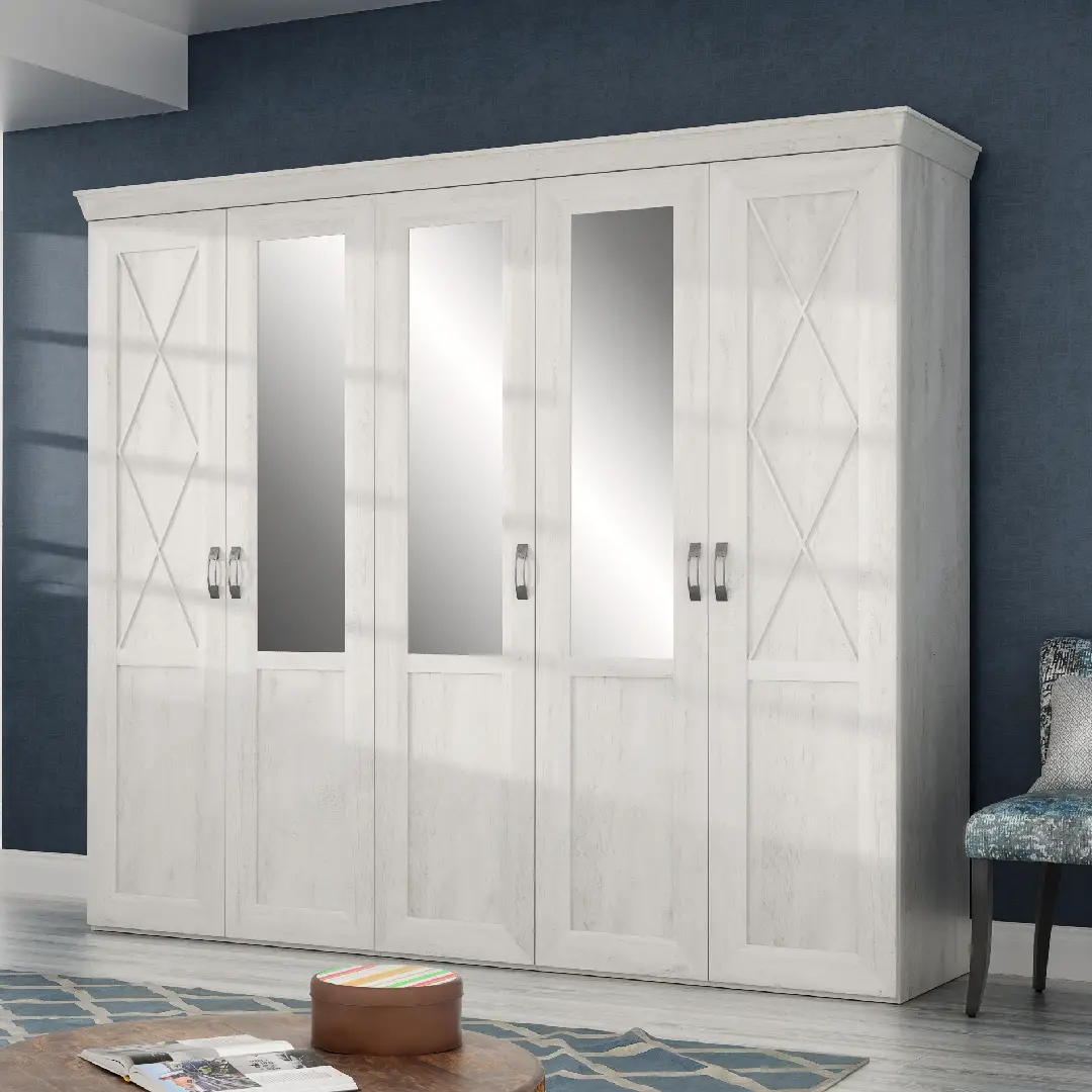 Las 2 puertas laterales están hechas de madera blanca pino, mientras que las 3 puertas centrales cuentan con un elegante espejo hasta la mitad, que no solo ofrece funcionalidad, sino también un toque de sofisticación y luminosidad a tu habitación.