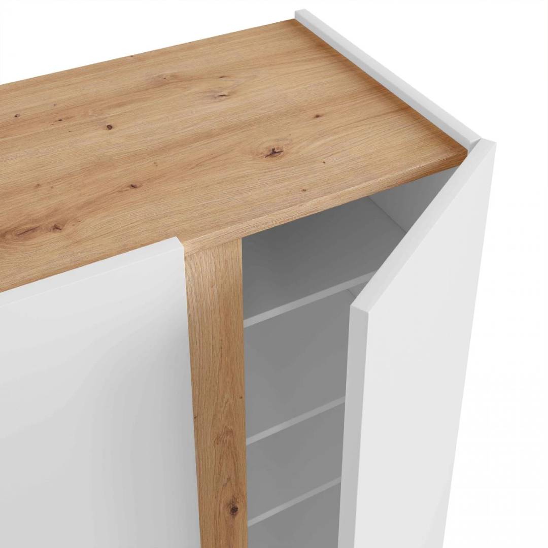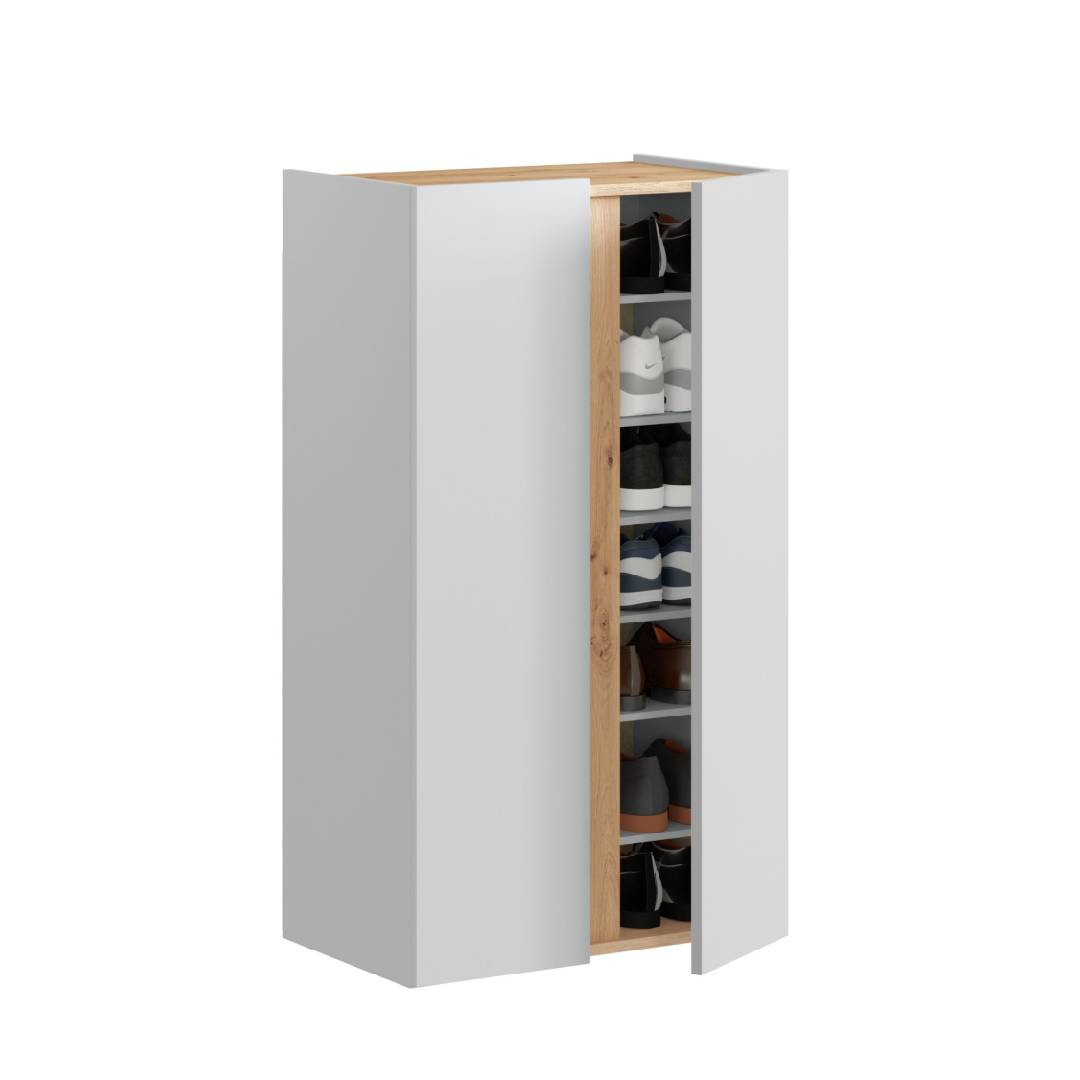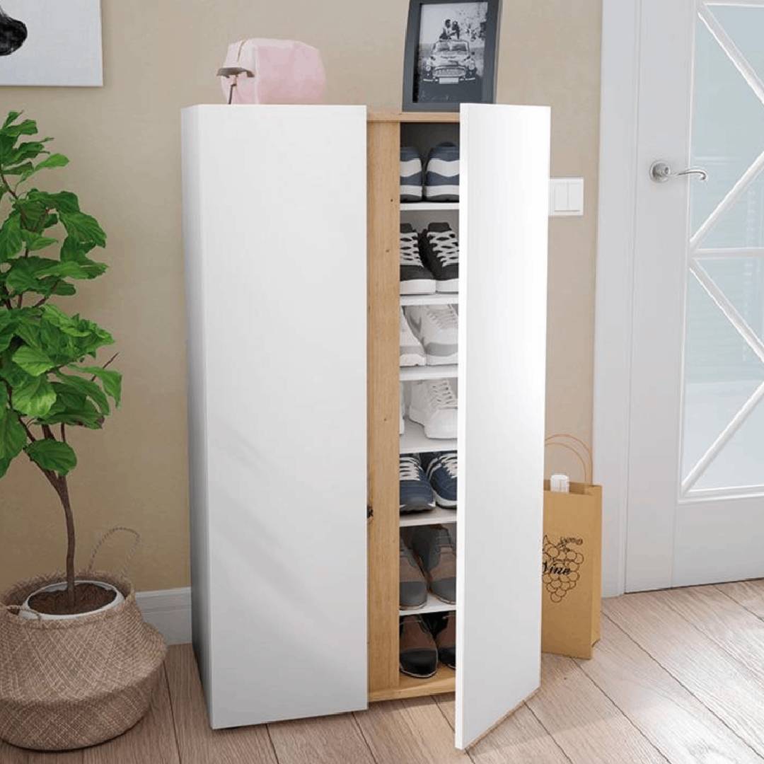 El armario zapatero Julia es un mueble auxiliar compacto y funcional, ideal para entradas, pasillos o dormitorios. Dispone de 2 puertas y 6 estantes regulables en altura, ofreciendo una buena capacidad de almacenaje y organización.