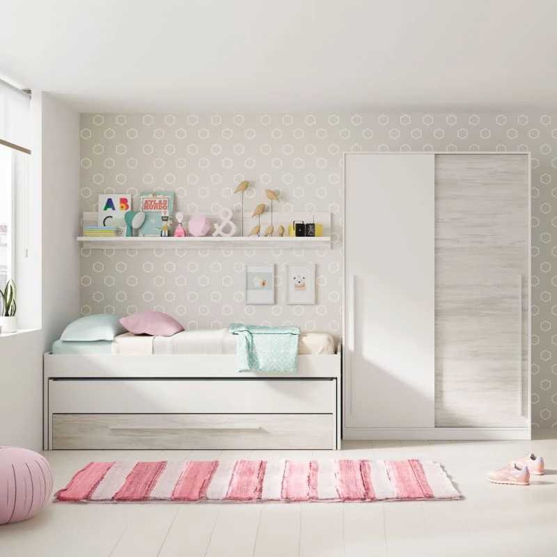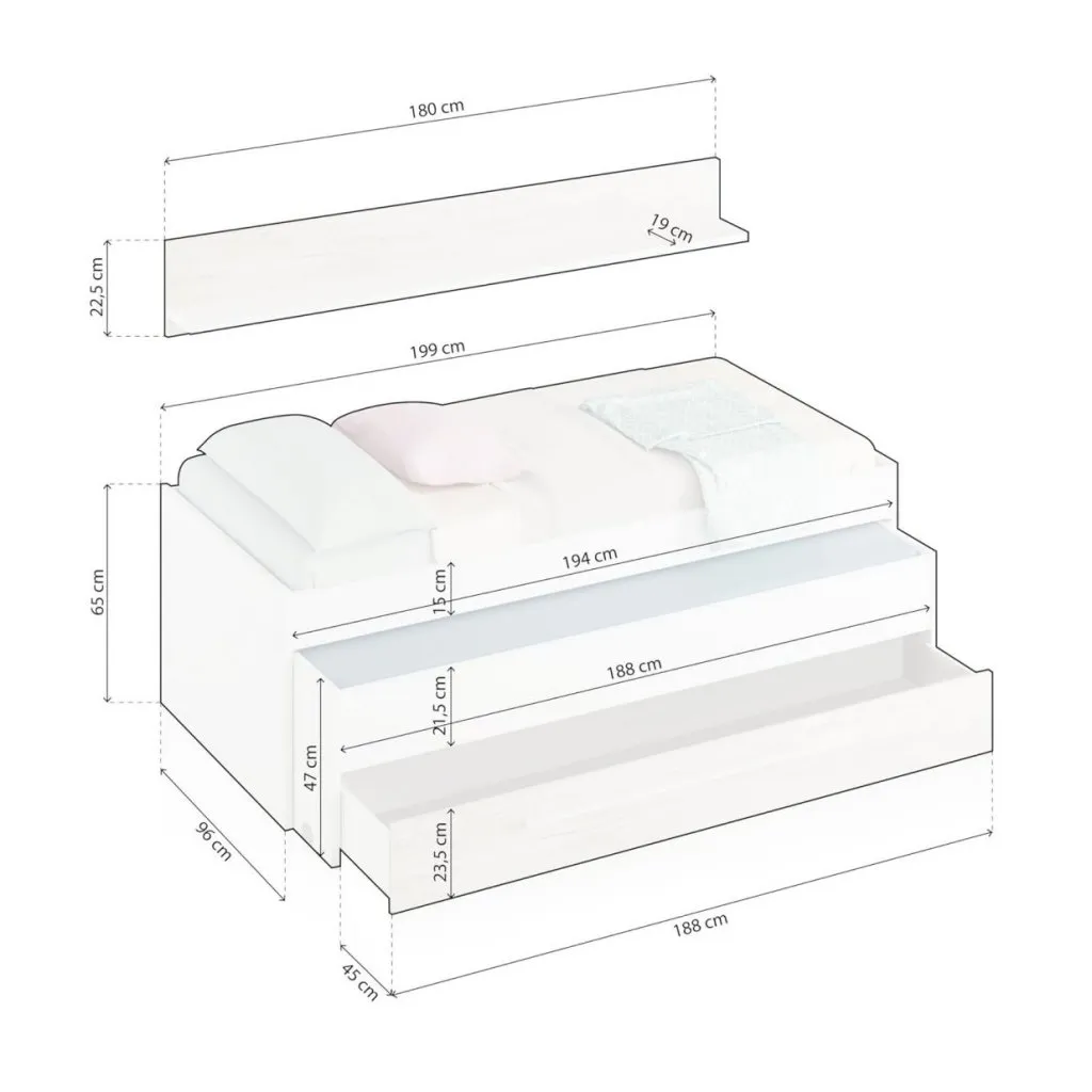 Cama doble para colchones de 190×90 (cama superior) y 180×90 (cama inferior) con un cajón en la parte inferior del mueble y un estante de colgar.
