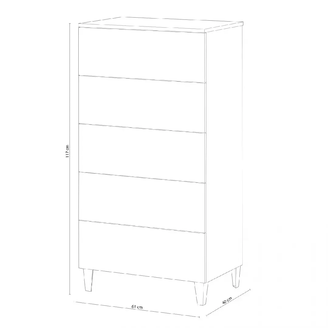 Cómoda compuesta por 5 cajones y 4 patas.