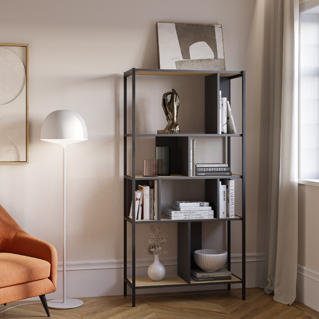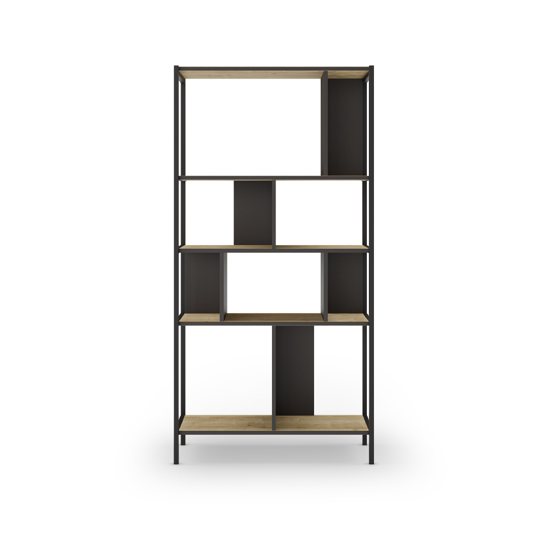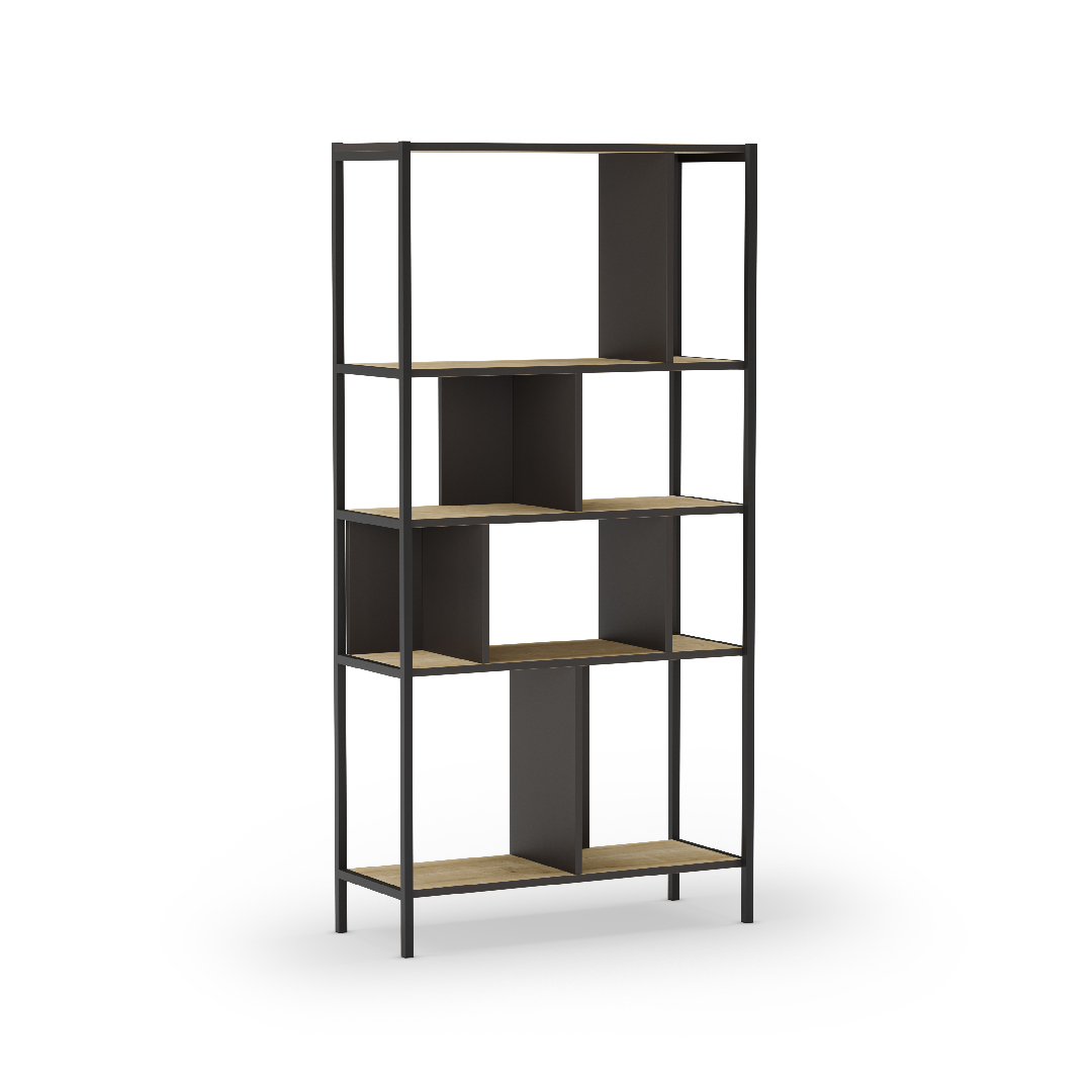 Con sus amplios compartimentos abiertos y cerrados, esta estantería es ideal para organizar libros, objetos decorativos o almacenaje auxiliar. Su diseño moderno y funcional encaja a la perfección en salones, despachos o dormitorios con estética industrial, nórdica o moderna.
