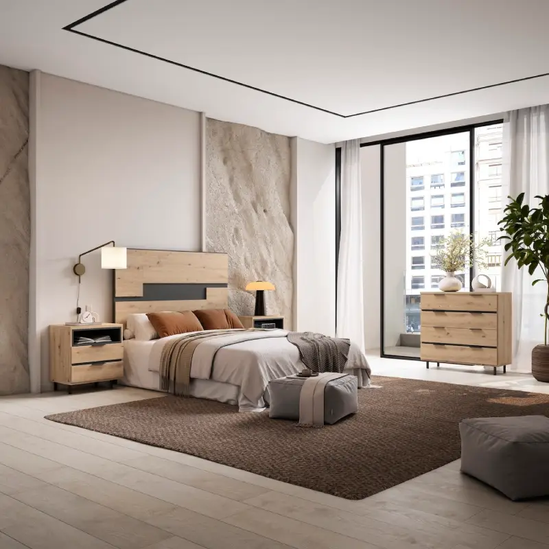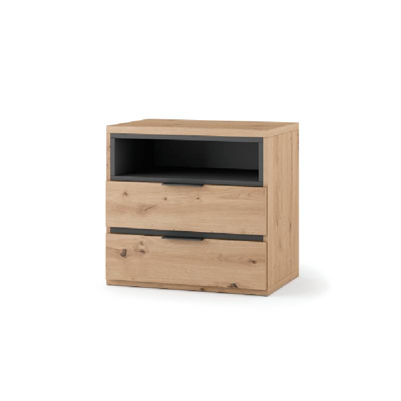 Mesita de Noche Kaia de 2 Cajones + Hueco acabado en roble con tiradores de aluminio antracita, ideal para cualquier estilo de decoración.