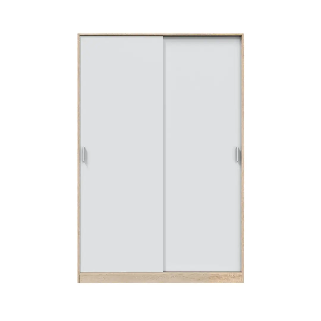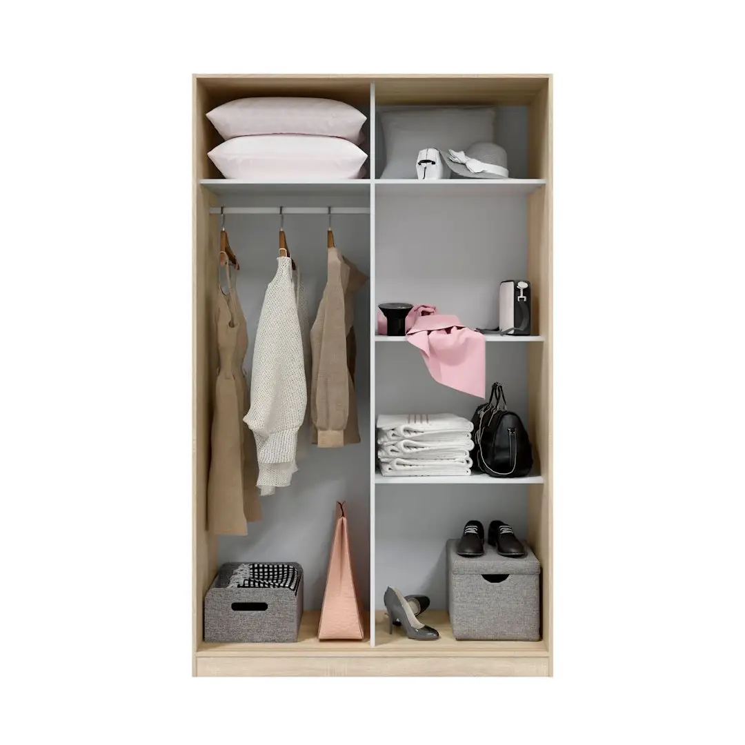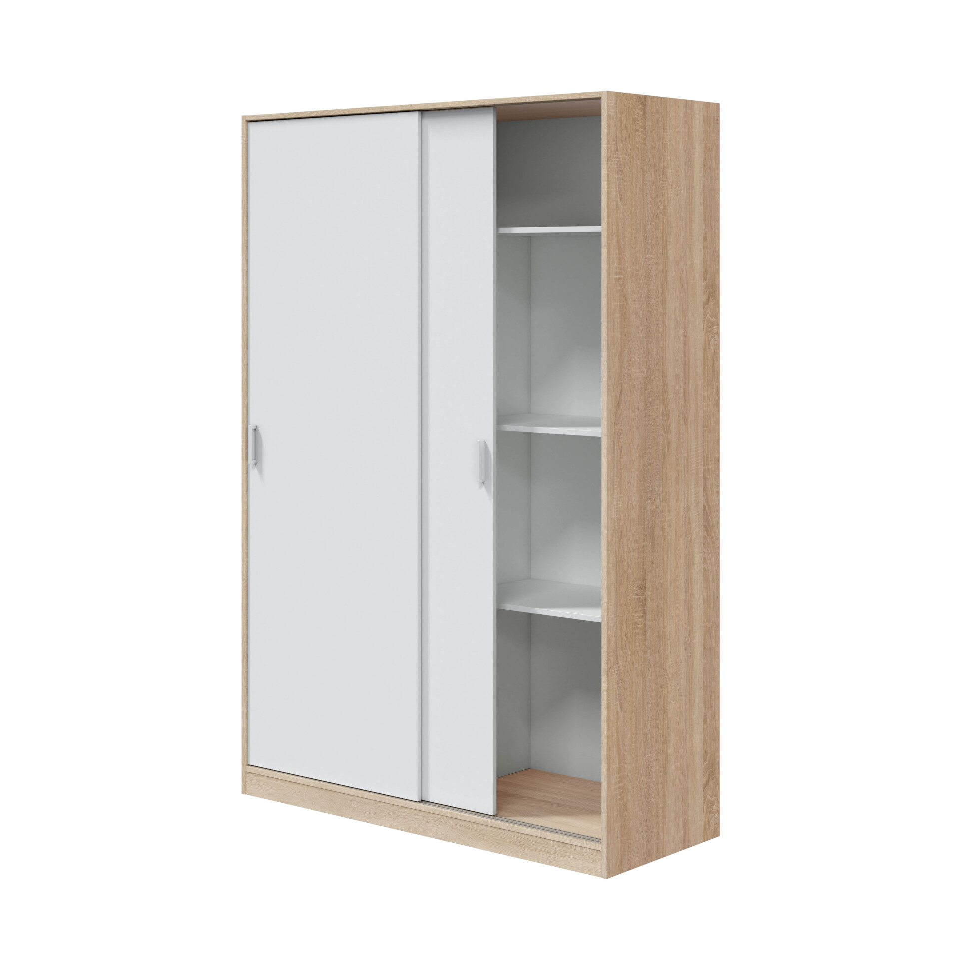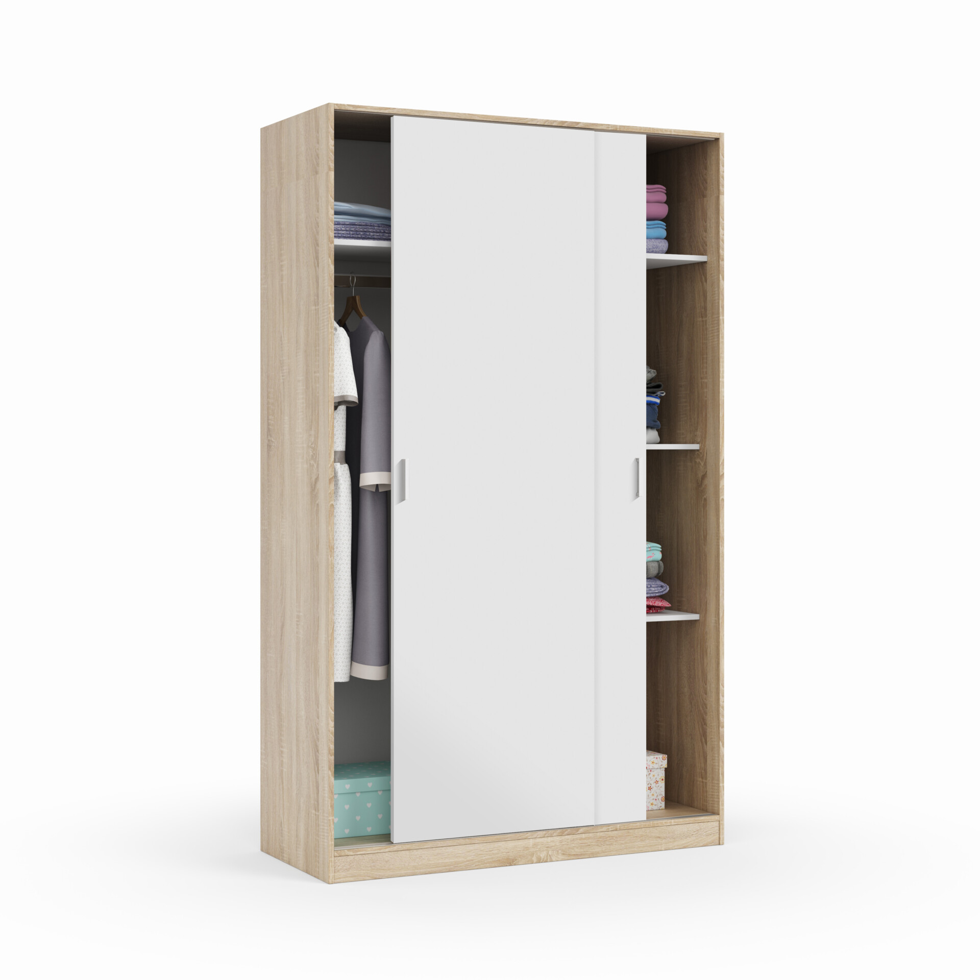 Armario compuesto por dos puertas correderas con barra de colgar y tres estantes en su interior.