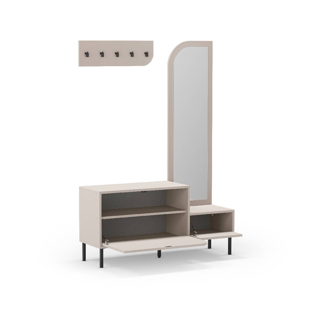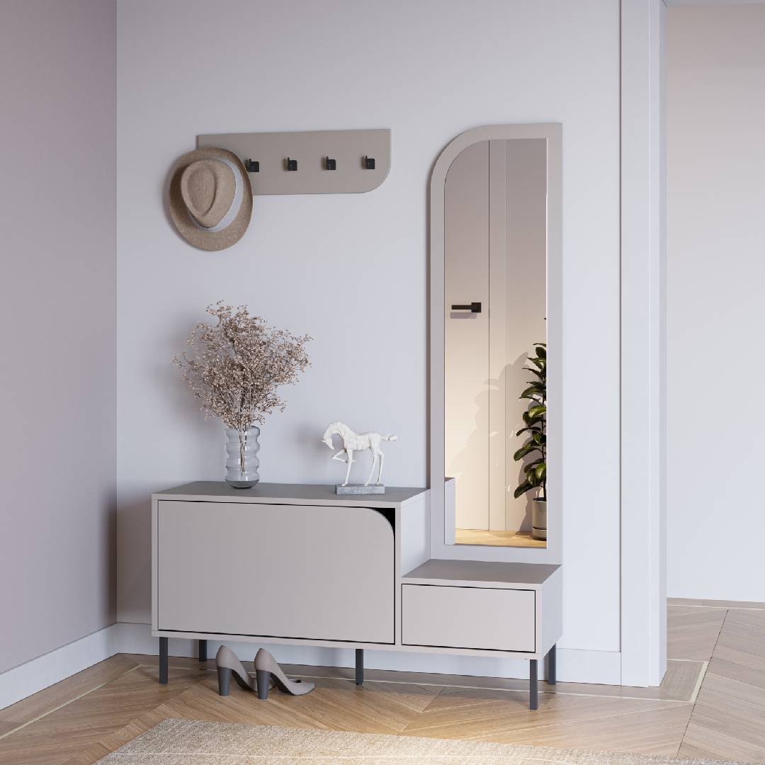Dispone de dos amplias puertas abatibles con capacidad para varios pares de zapatos, manteniendo tu hogar siempre ordenado. Además, incluye un espejo vertical de gran tamaño, ideal para completar tu look antes de salir de casa.
