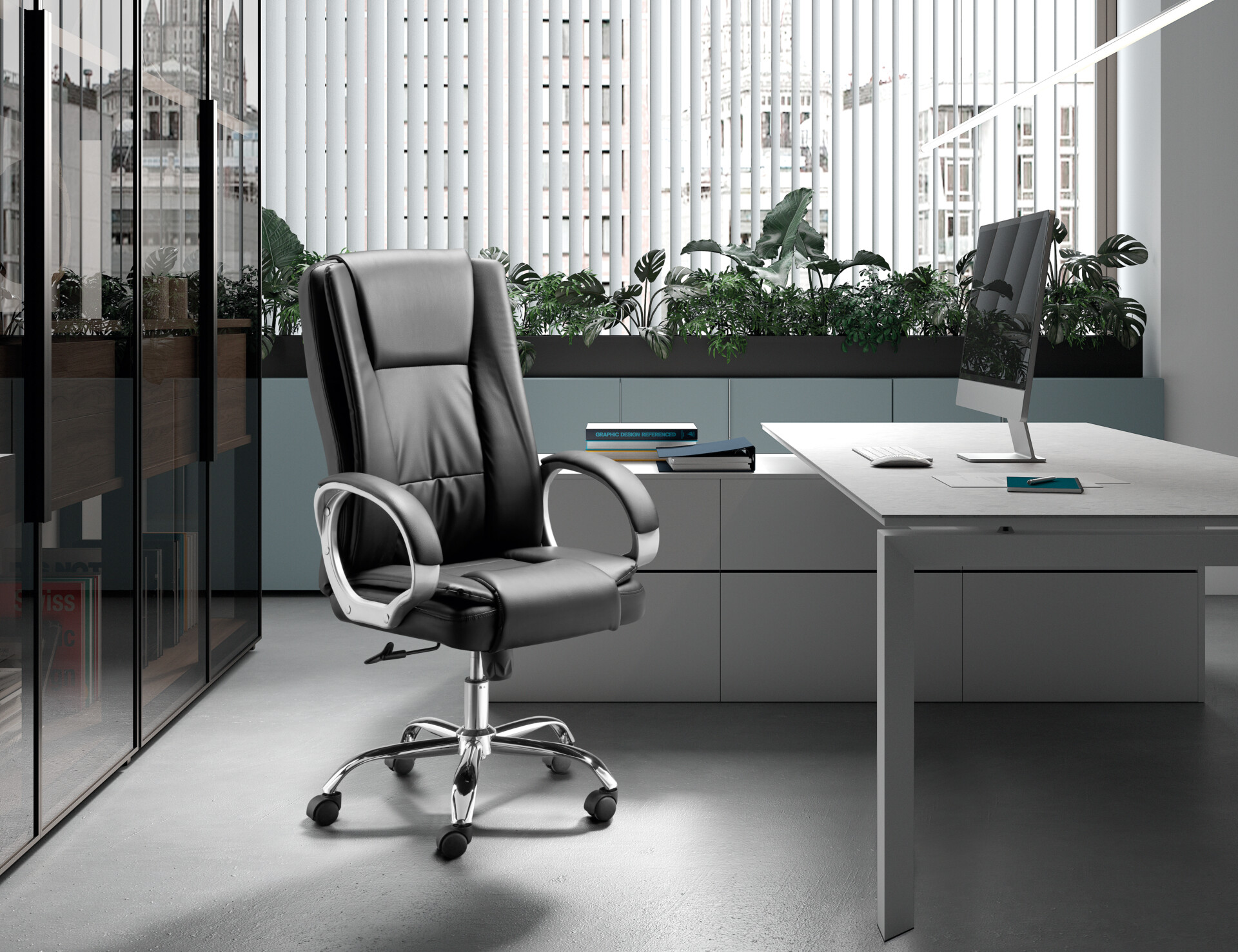 Con sistema de balanceo sincro y brazos fijos tapizados.