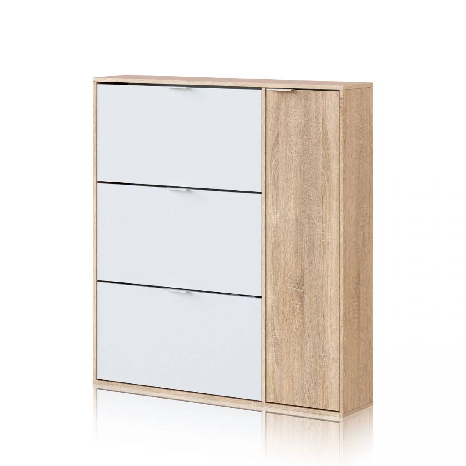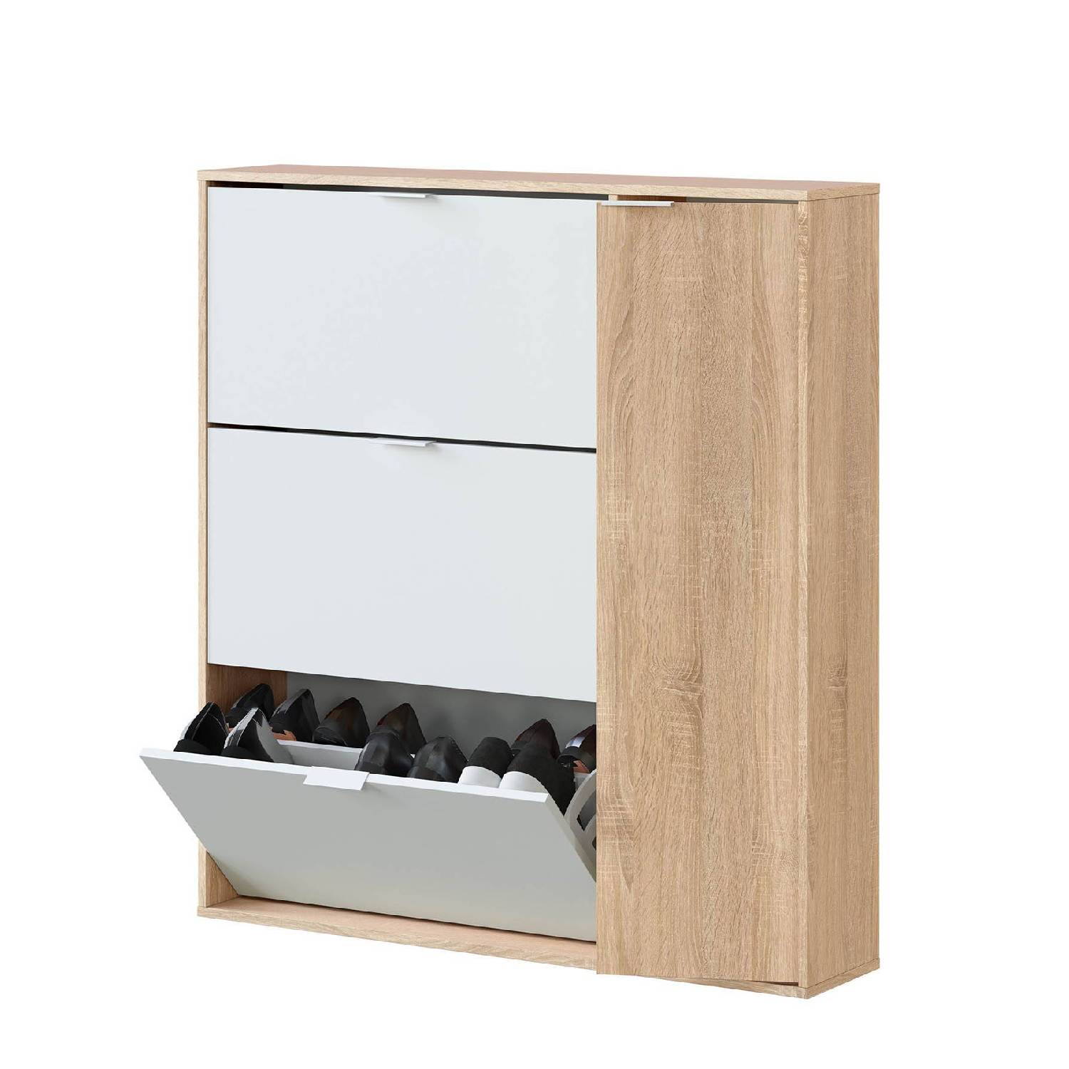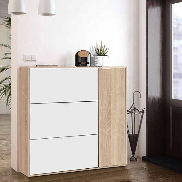 Mueble Zapatero color Roble Canadian / Blanco, compuesto de 3 puertas abatibles y 1 puerta a la derecha que esconde 5 estantes con capacidad total de almacenar 24 pares de zapatos aproximadamente.